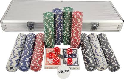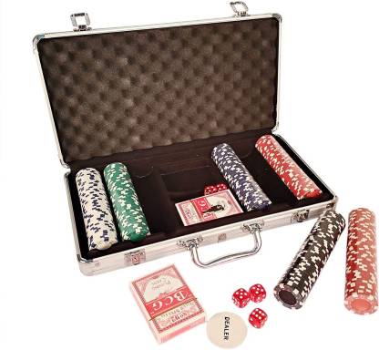 Casino Grade 300 Chips With Aluminum Case,2 deck of Playing Cards, 1 Dealer Chip, 5 dice For Texas Hold'em, Blackjack, Casino Games. Complete Poker Game Set India make